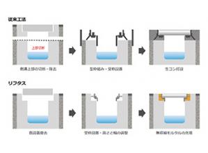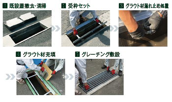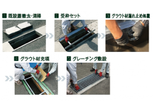 ・既設の蓋よりもひとまわり小さい枠をセットし、隙間に無収縮モルタルを充填し、既設側溝の蓋受け部と新しい受枠を固定させるところ。