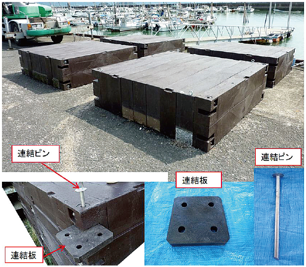 ●各ユニットの連結構造に連結板と金属製ピンを使用することで、従来のボルト・ナットでの連結構造と違い、水上組立作業をより安全(潜水士が不要)にし、設置後の水中点検を不要とした。