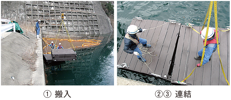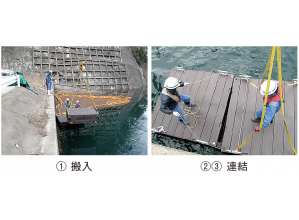 水上組立作業は潜水士を使う必要がなく、設置後の水中点検も不要なため潜水作業の危険性が排除できる。