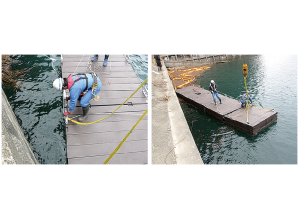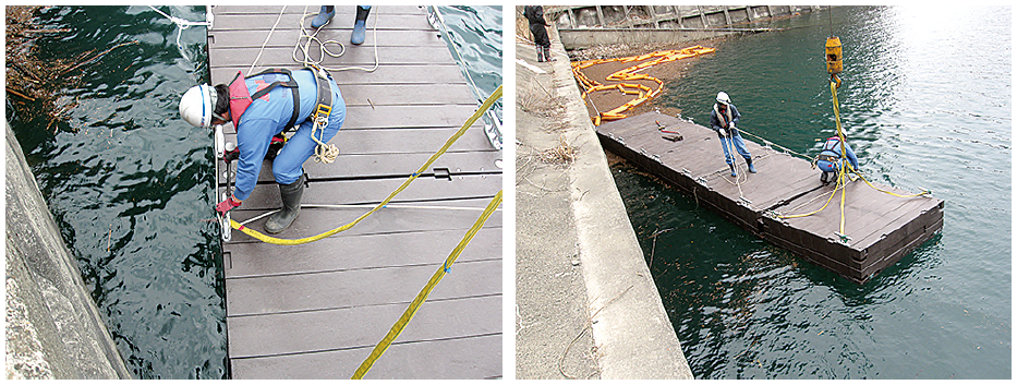 ●水面上30㎝以上の乾舷量を確保し、発泡スチロール製フロートや中空プラスチック製フロートを使用した浮桟橋とは違い、全表面に堅牢性を持たせたことにより、作業時の安定性・安全性を向上させた。