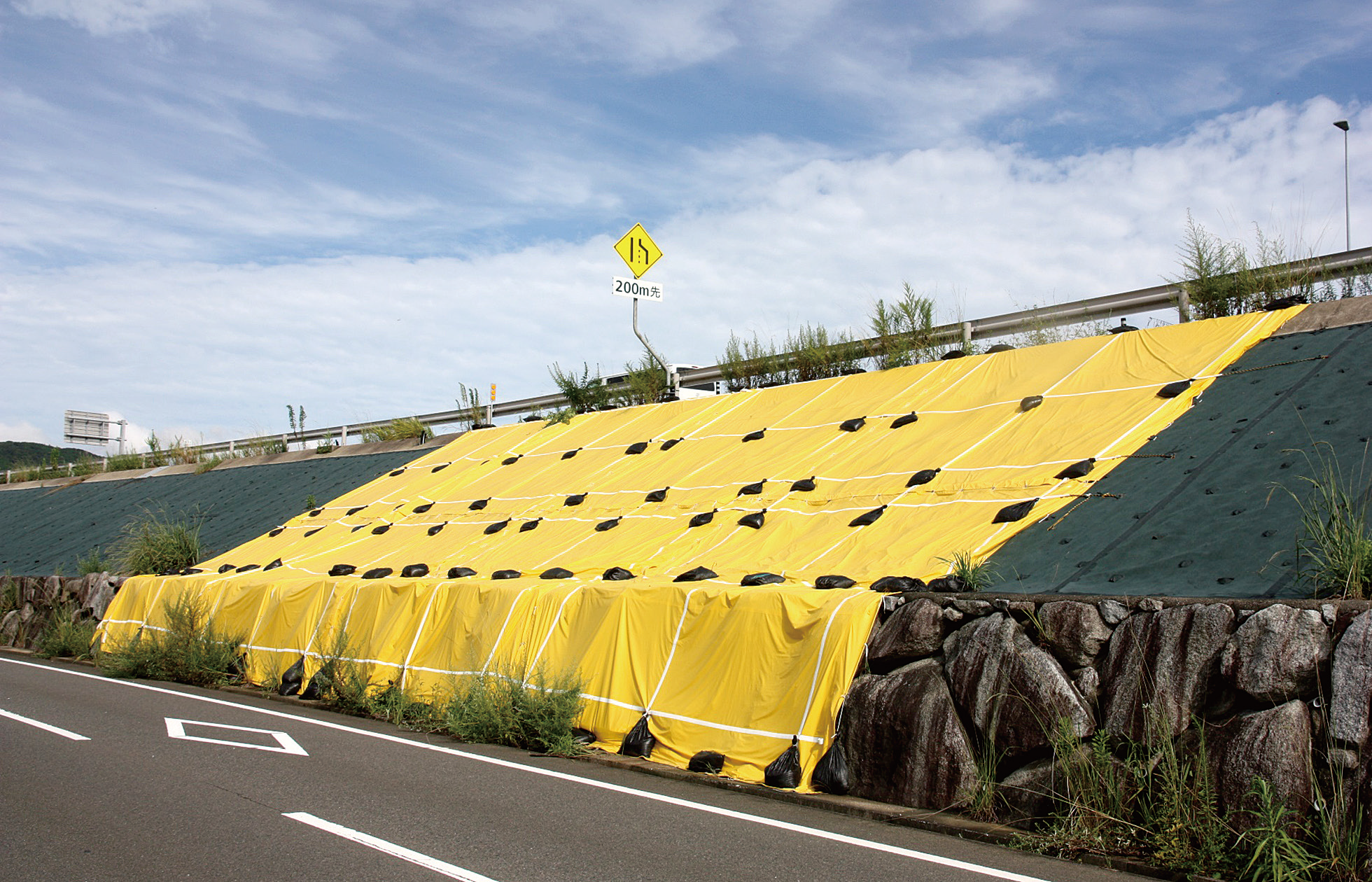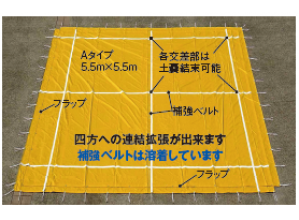 ・シートの強度が高く破れにくく、単管パイプ等を用いて地山等に強固に固定できるため、シートのまくれを抑制できることが期待できる。