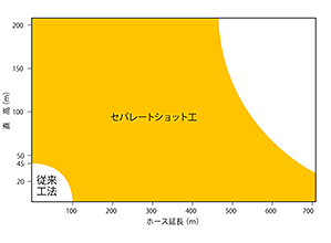 ・従来工法では施工機械の移動をやむなくされていた長距離(ホース延長700m以内)、高揚程(直高220m以下)の吹付が機械の移動をすることなく施工できる