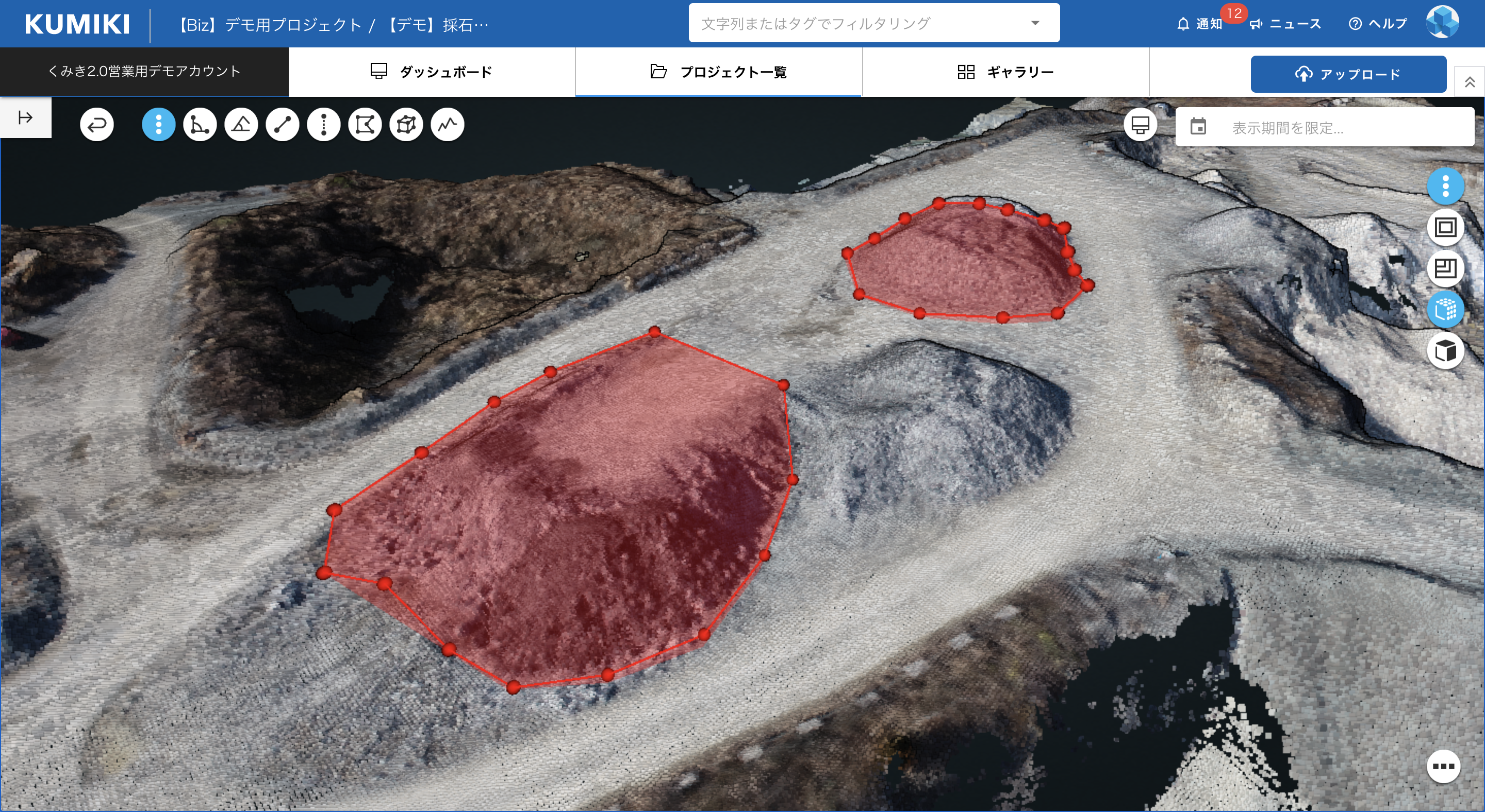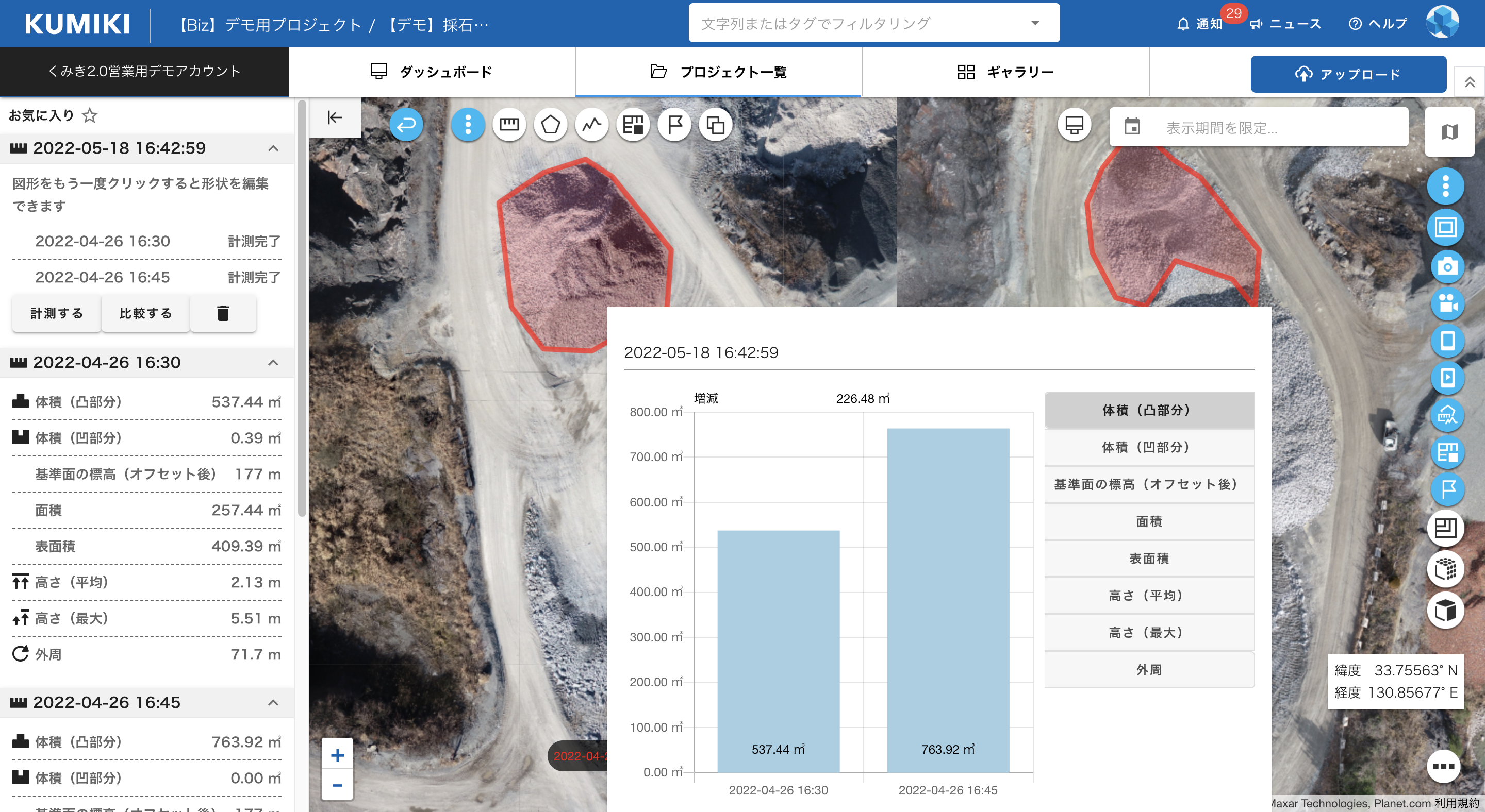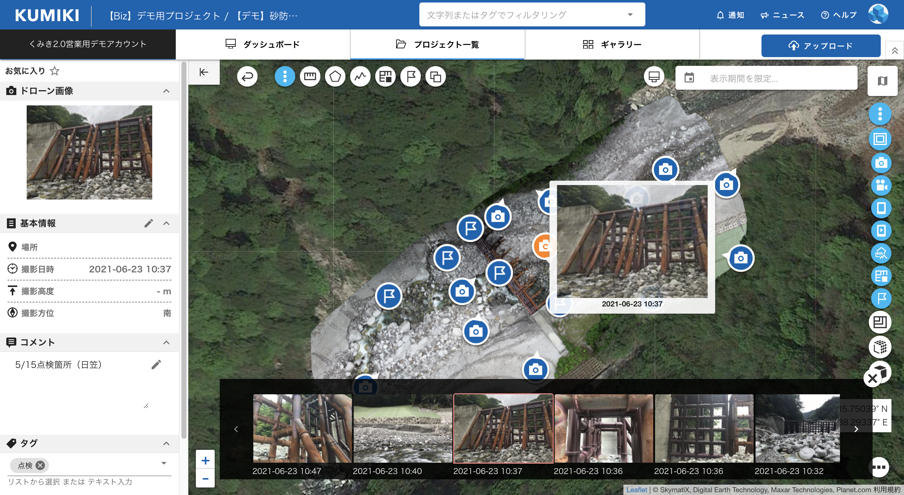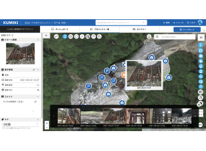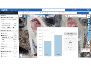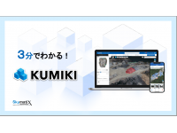 オルソ画像や3D点群といった地形データを自動で生成、面積・体積・断面等の本格ドローン測量が専門知識なしで実現できる。また、位置情報に基づき地形データ上にデータがアイコン表示され、写真や資料まで一元管理できるシステムは『くみき』のみである。さらに、処理ソフトを含め全て自社開発している安心・安全の純国産サービスであり、柔軟でタイムリーな製品改修も可能。
