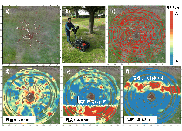 ・位置情報が地中レーダ探査結果と自動的に関連づけられることが可能となり、測線設定の必要がなくなり測線設定に関わる作業がなくなるため、施工性(工程の短縮)および経済性が向上する。