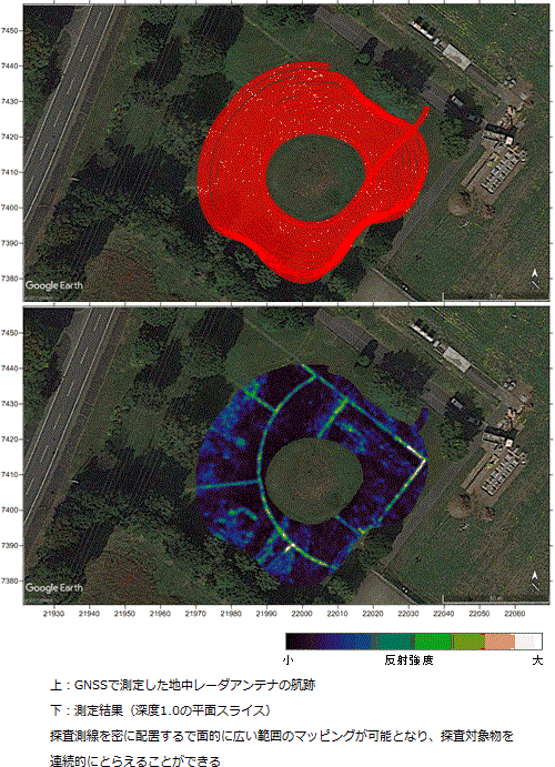 ・時間の補正を行うことにより、地中レーダ検出位置の精度が向上し、複数回走行のデータを一度に取り扱い、解析することができるため、施工性(測定効率)の向上が図れる。