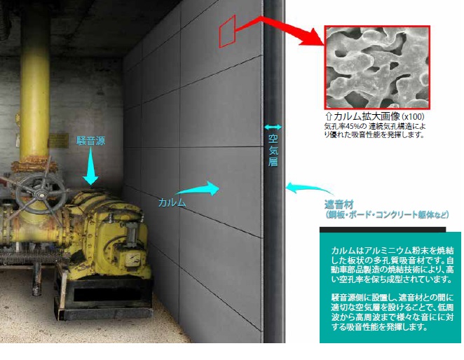 一般的な吸音板や遮音板から、多空孔のアルミニウム焼結板を用いた吸音板に変えたことにより、騒音の周波数範囲に合わせた吸音が可能となるため、周辺環境への影響抑制および品質の向上が図れる。