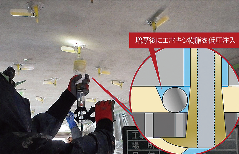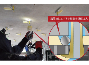 ・超低粘度エポキシ樹脂を注入して、ひび割れや微細空隙を補修するため欠陥のない完全な一体化補強効果が期待できる。
