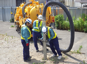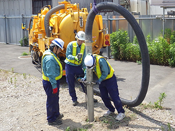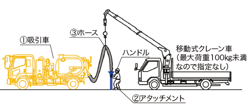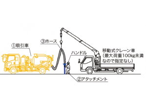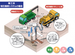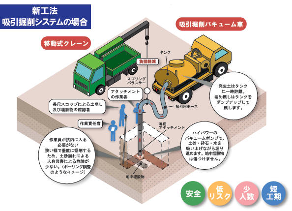 掘削構内の既存埋設物を確認し、事前に十分な対策を講じることで、機材の接触による破損や事故を抑止する。掘削穴に入らず地上面から作業することで作業者の安全を確保するとともに、施工品質向上を図る。ハンドホール・マンホール内の溜水の排出といった課題にも対処可能。最小4名からの少人数施工に対応するため、人件費削減にも貢献する。吸引した発生土はタンクに収納するため現場を汚さず、搬出の手間もない。