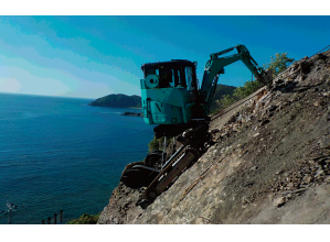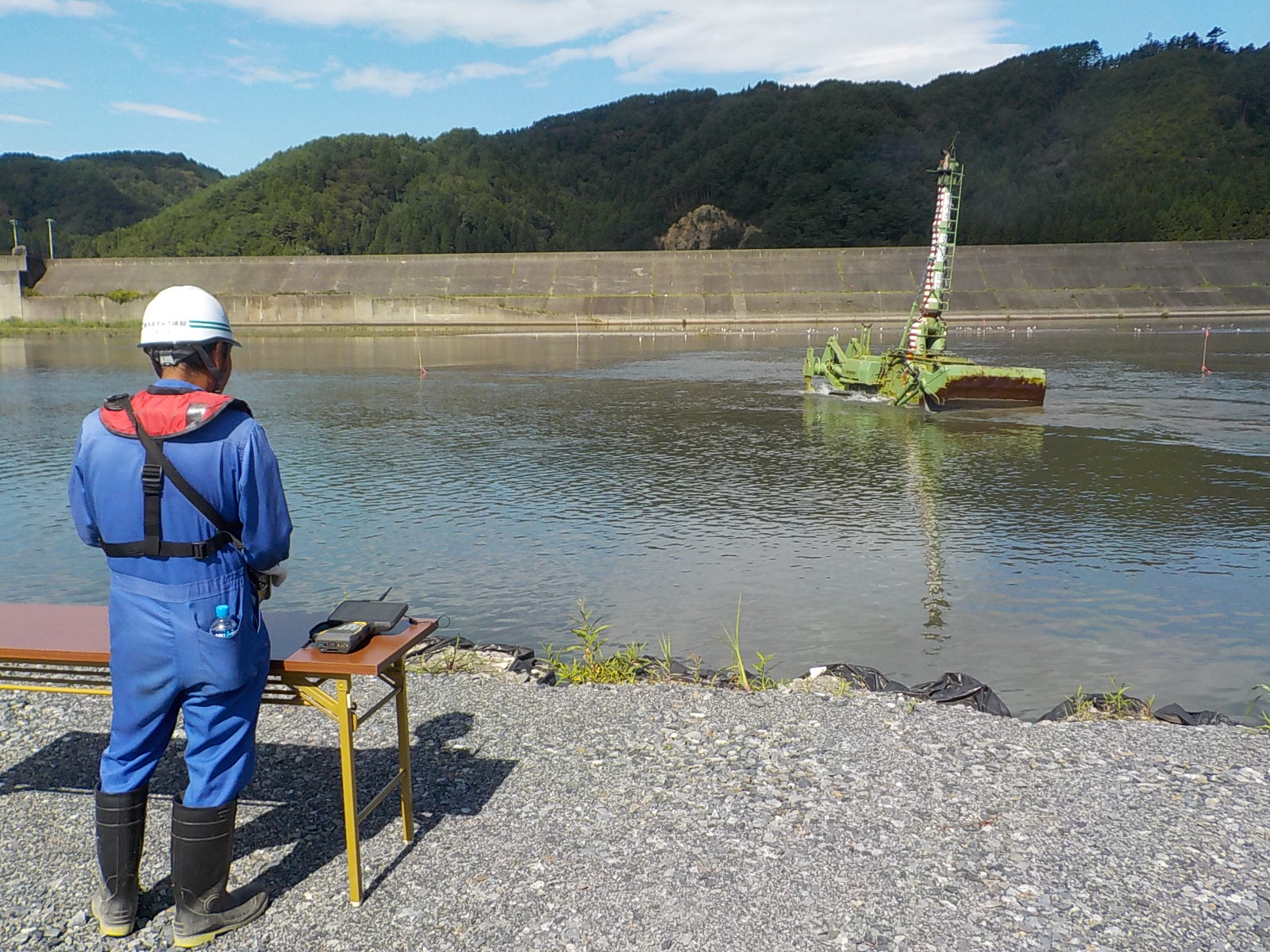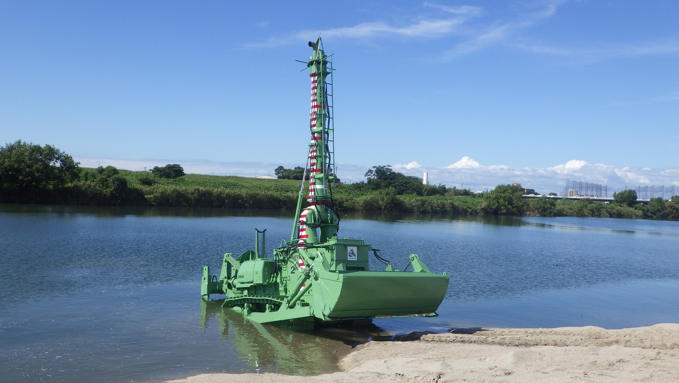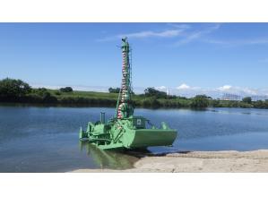 ・陸上部から水深7mまで稼働可能であることから、作業船では喫水を確保できない場合や、陸上機械では水替えや瀬替えを必要とする浅水域において威力を発揮する。