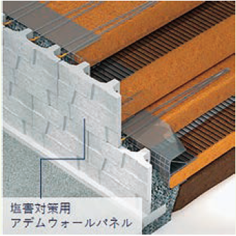 (1)ひび割れに強いコンクリートパネルで、鉄筋を使用していないことから発錆の可能性がなく、塩害および凍結防止剤の影響に強いため、耐久性の向上が図れる。