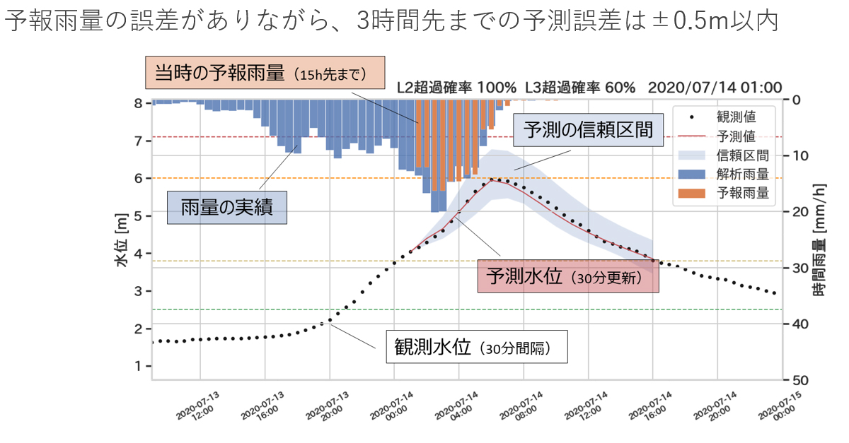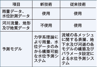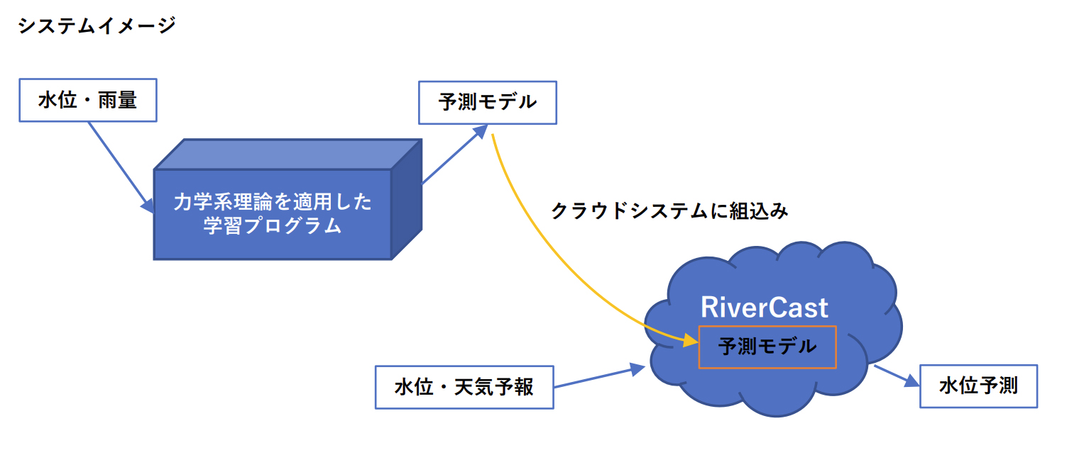 従来、河川の予測モデル(物理モデル)を作成するには河川の測量、水位・流量関係式の構築等に多大なコスト(数千万から1億以上)と期間(約1年)を要していた。リアルタイム洪水予測システム(RiverCast)では、過去の水位・雨量データがあれば、1ヶ月程度で水位予測モデルが作成でき、モデル構築にかかる期間とコストを大幅に削減することが可能となる(期間:約 1/12、コスト約 1/6 以下)。これにより、今まで導入を断念していた中小河川でも導入を検討することができるようになった。またAI(人工知能)モデルでは、学習データにない未経験の洪水規模についての予測が不安定になる場合があるが、リアルタイム洪水予測システム(RiverCast)は、先端的な非線形時系列解析手法を取り入れており、これまで経験したことのない想定外の降雨に対する予測が可能となった。