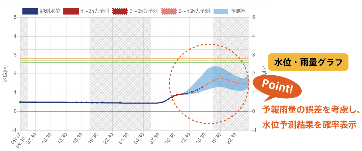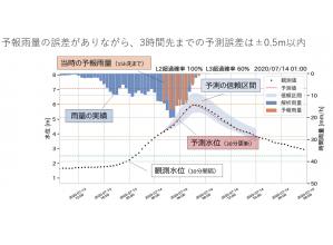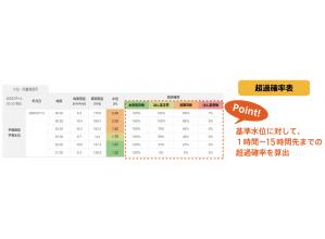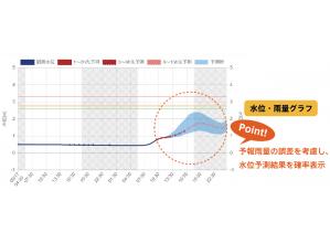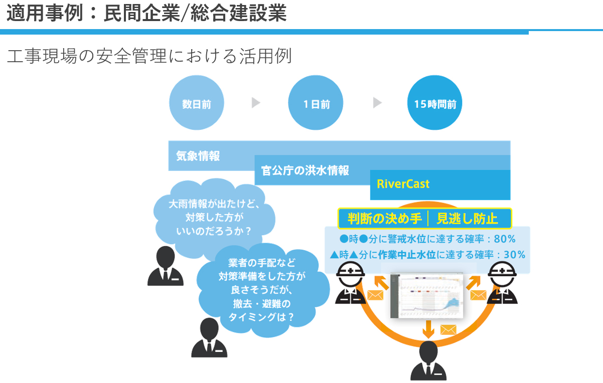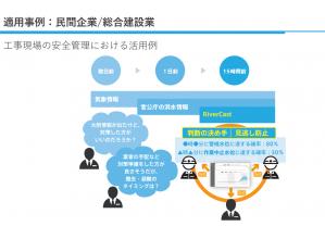 適用条件としては、インターネット端末からクラウドサーバーへのアクセスが可能なネットワーク接続環境であること。適用場所は、河川改修工事、橋梁工事など河川近傍で行われる公共工事。これまでにない画期的な予測システムとして、リリース前から注目され、現在では、全国13自治体、多くの民間企業で実績がある。地域防災計画や河川、遊水地施設の管理、河川工事現場の安全管理など、さまざまな場面で活用されている。さらに国土交通省の発注工事では、100件以上の入札技術提案に採用されており、今後、本システムの導入が加速化される予定である。今後は、洪水予測だけでなく、さまざまな物理現象に応用可能。例えば現在、(株)構造計画研究所では高潮の予測に対する技術開発を行っている。港湾施設等への高潮予測などの提供が可能となる見込みである。また水位予測結果を用いて水門・樋門や排水機場などの自動運転などにも展開を考えている。