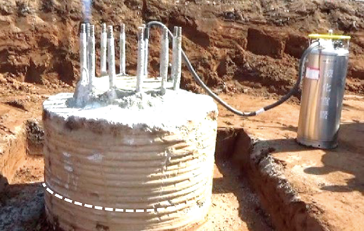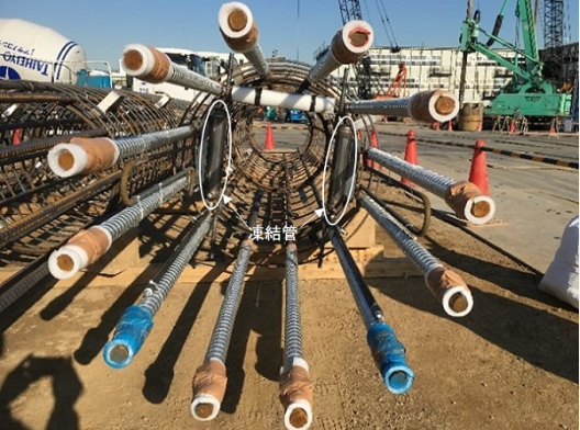 ・凍結管は鉄筋かご建込時に所定位置に取り付け、凍結管に液体窒素を注入することで、水平ひび割れを発生させる。