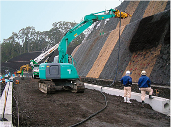 ・ダムや造成などの建設工事に伴って発生する伐採樹木、根株、流木あるいは型枠廃材などの建設発生木材を現場でチップ化、堆肥化してのり面緑化工の生育基盤材として利用する。それにより、建設発生木材の現場内ゼロ・エミッションを実現するとともに、産廃処理費用も含めたトータルコストの縮減が可能