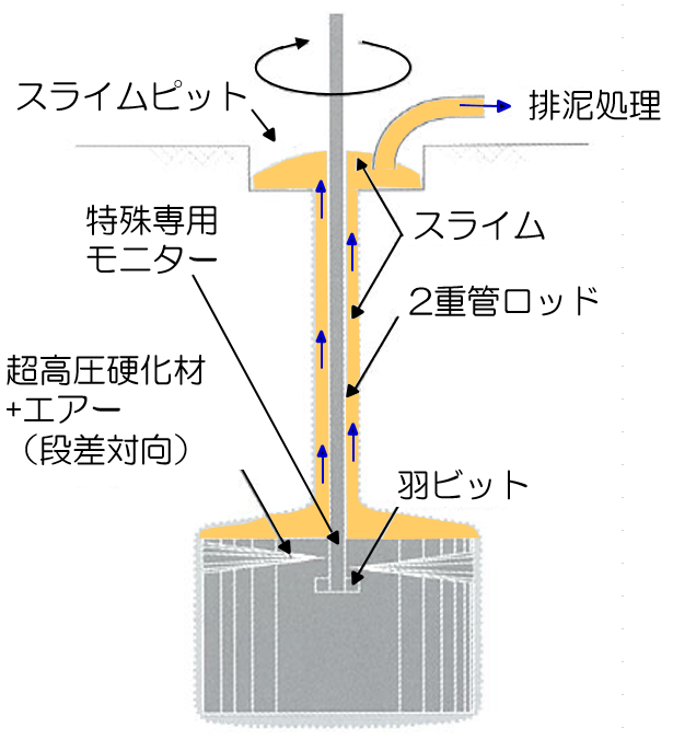 独自開発の高い噴射効率を発揮する特殊専用モニターを使用し、大口径の改良体を高速で造成する。