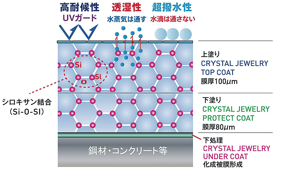 ・ゴム面に施す事によりオゾン劣化を抑制させ支承ゴムの耐久性が向上する事と変形追随性に優れるためコンクリートがひび割れを生じた際に追随しコンクリートの中性化予防もとしても優れる。