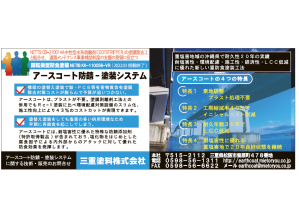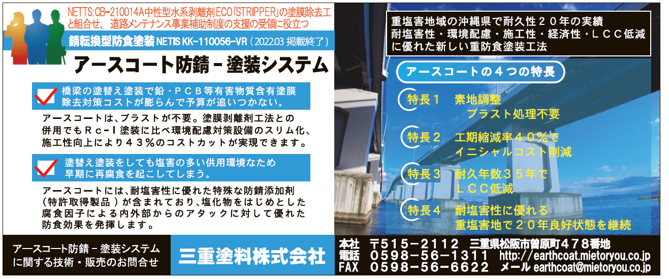 ・アースコートシステムの効果 : 鋼構造物の長期防錆性確保、VOCの低減化、工期の短縮化、メンテナンス期間の延長化ができ、更には耐塩害性の向上が期待できる技術である。また、ブラスト処理の必要が無い為、動力工具処理は対応可能業者が多い為、人手不足問題をも解消できる。