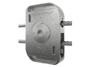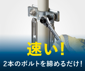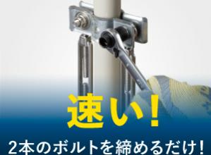 予め組み込まれた2本のボルトを締めるだけ。鋼管への取り付け、ワイヤーロープ取付時の部品落下を最小限に抑え、作業時間の短縮と安全性の確保を両立。