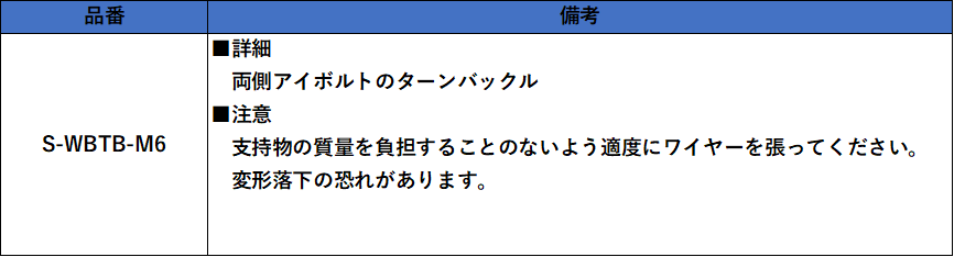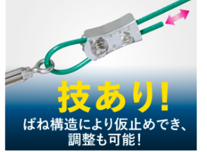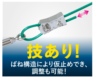 ばね構造により仮止めでき、調整も可能。ワイヤーロープ止め金具はワイヤーへの仮止めが可能。ワイヤーを通した後の長さ調整も可能。