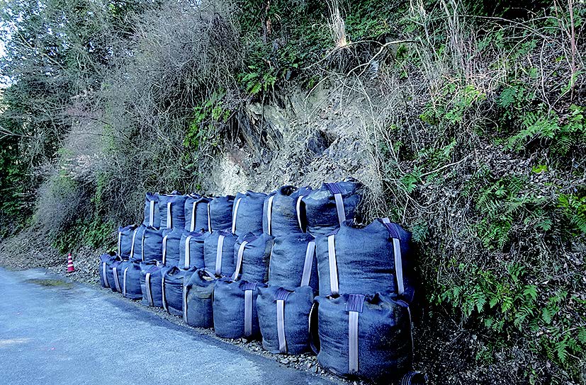 従来の植生土のう(幅40(41)×長60cm)を用いた人力施工による土のう積みから、植生土のうを大型することでバックホウなどの建設機械による機械化施工を可能とした。