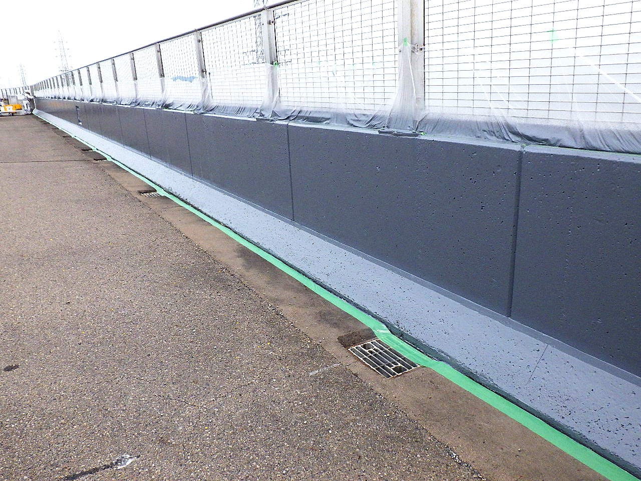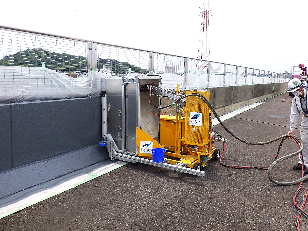 高架橋壁高欄(コンクリート、鋼板)にSQS防水塗装を自走式機械「STスインガー」で自動化施工する技術。工程と交通規制期間の短縮が図れる。