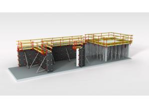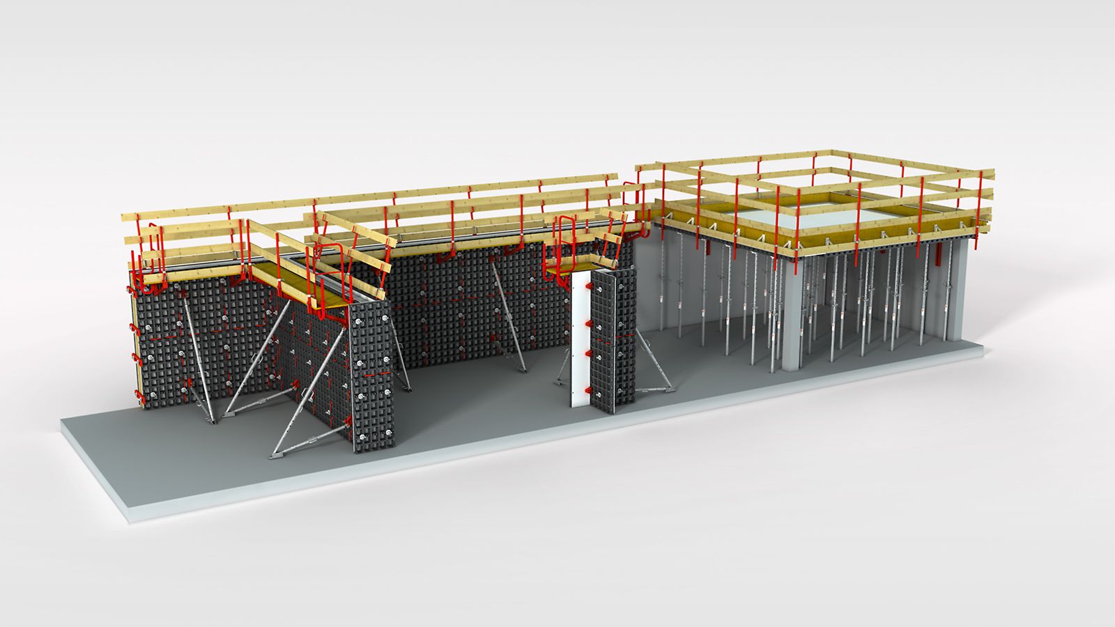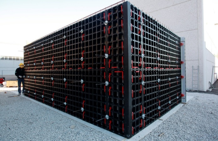 一般的な合板型枠から、部材数が少なく軽量・組立が容易で、70~100回転用できる100%リサイクル可能な樹脂製システム型枠に変えた。