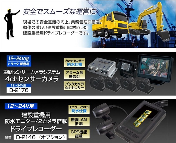 (2)ドライブレコーダーとバックモニターによる重機後方安全確認支援:ドライブレコーダー+映像モニター(D-2146 オプション)