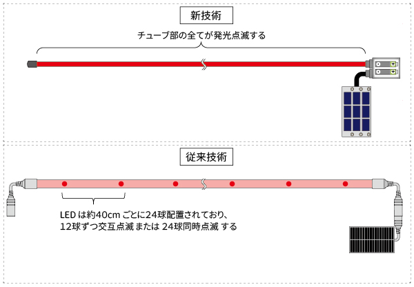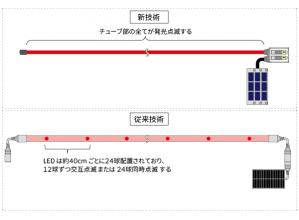 従来は発光体にLEDを用いていたのを、無機ELワイヤを用いることに変えた