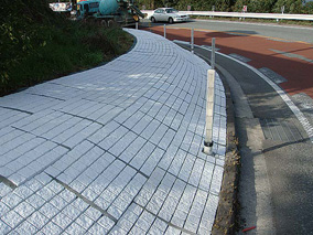 ・表面が擬石模様仕上げのフレキシブル平板は人力施工製品なので、重機搬入が困難な狭小現場などの交通規制を最小限に抑えられる