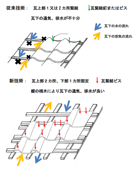 ・桟木構造に縦桟木を追加したことにより、瓦下の通気、排水が良くなるので、耐腐食性の向上が図れる。
