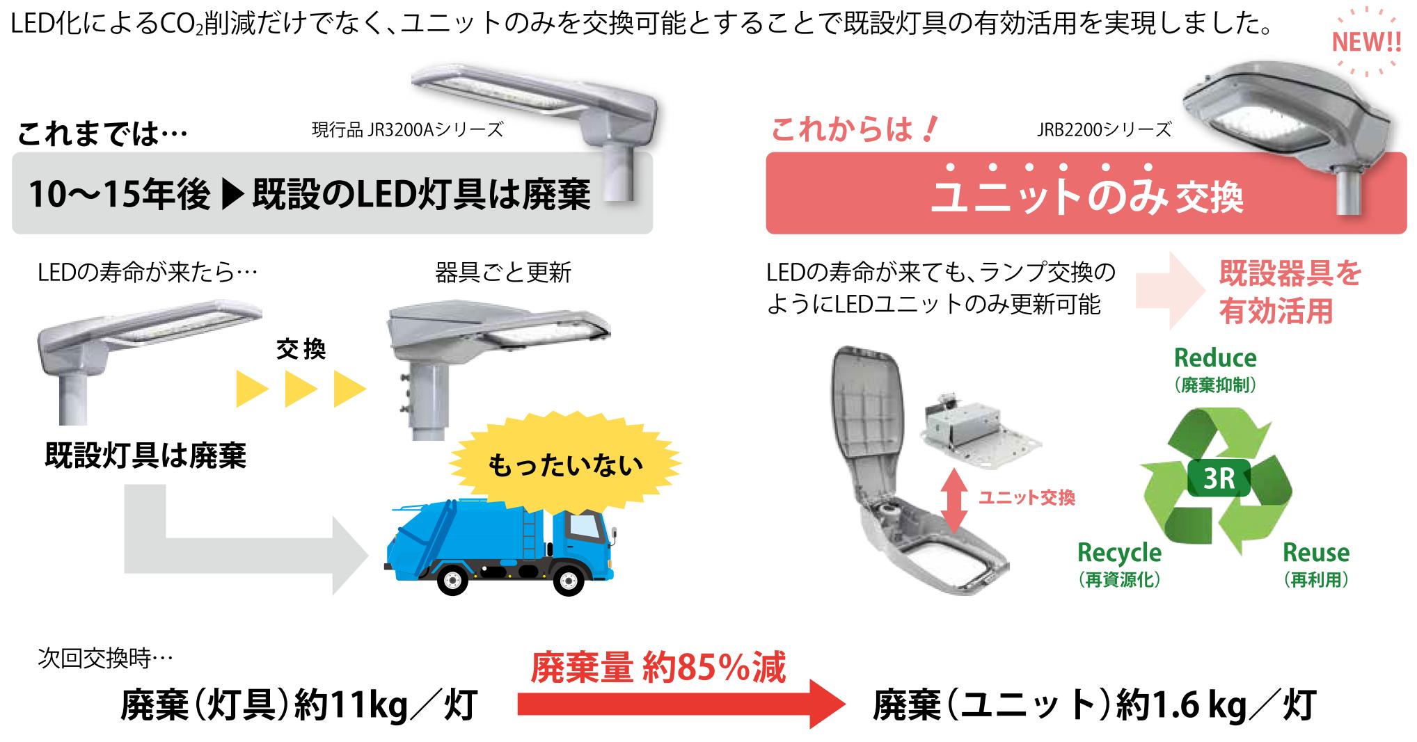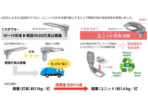 本技術であるLEDユニット交換式道路照明器具を採用することで、LED光源の寿命が来ても筐体を流用し、LEDユニットのみ更新が可能となり、廃棄物低減に期待できる