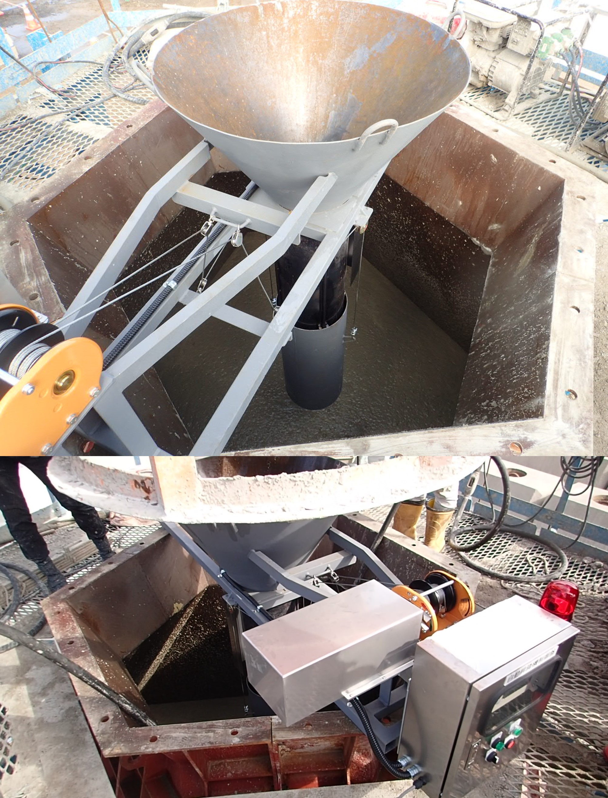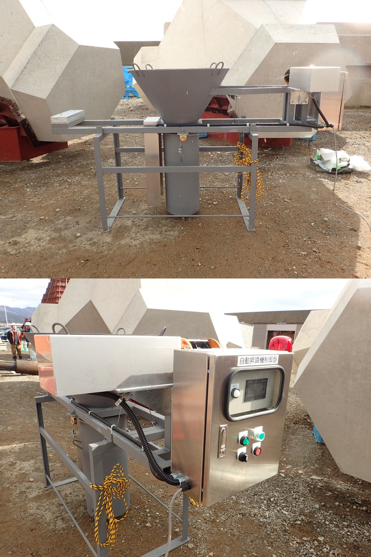 ・縦シュートとガイドホースだったものを、縦シュートに変位センサー、ウィンチ、自動伸縮機能、制御装置を設置しシステム制御できるように変更した。