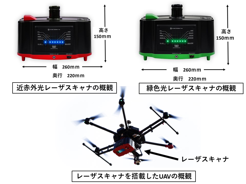 ・近赤外線および緑色光のレーザ用スキャナは、共にペイロード3kg以上の汎用ドローンにワンタッチで脱着できるため、ドローン測量システムの運搬が容易で、現場の組み立ても簡便にでき、作業全般が誰でも迅速にできるため、測量作業に要する労力を大幅に削減可能。