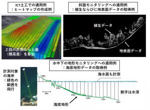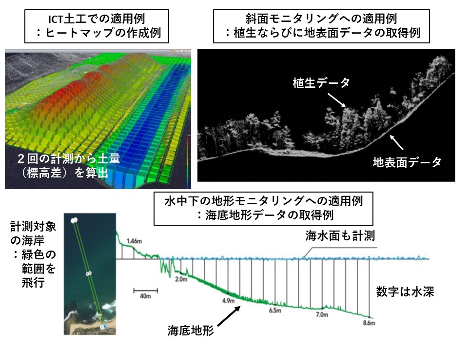 ・陸上の地形や構造物は近赤外線レーザで測量し、河道内の河床や海底などの水面下の地形あるいは構造物は緑色光レーザで測量するという、陸域から水域までの広域の3次元レーザ測量が実施できる。これにより、従来の写真測量では得られない樹木下の地表面の地形や、音響測深が不可能な浅い水深の水面下地形を簡便に測量可能。
