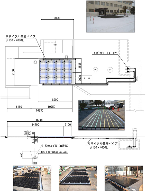 (2)中空路盤構造にすることにより、構造が単純・軽量となり設置作業中の工事事故が抑制される。また、融雪水の貯留及び地下浸透が容易となり、砂利や砂層を暖めることなく中空部・多孔質層を経て直接地上の雪氷に空気を作用させることが可能となった。