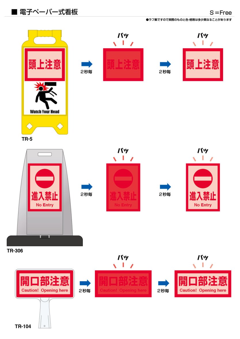 (3)電子ペーパ式看板は、簡便な操作で看板の表示部を有色面と白色面に反転表示させることができ、作業員への視覚効果により注意喚起を高める事が出来るため、安全性の向上につながる。