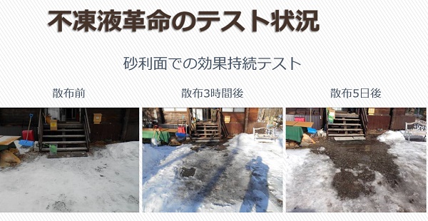 本技術(製品)は、液状の為、どの様な形状の路面や対象物の表面になじみやすく、散布箇所に留まる率が高いのでより均一的な凍結防止効果を得ることが可能。
