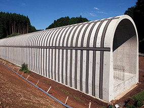 ・アーチ形状を構成するプレキャスト部材は、中心角60度で等分割されたアーチ部材3つと脚部材2つで、アーチ部材にはPC構造を適用し、RC構造の現場打ち底版コンクリートと組み合わせるPRC構造で構築する閉合断面のプレキャスト式アーチカルバートとした。
