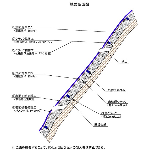 ・既設モルタル面の剥ぎ取りを伴わないため、産業廃棄物の発生を抑制でき、経済性の向上が期待できる。