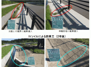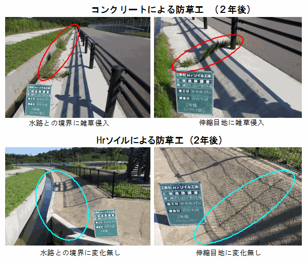 ・本技術による吹付は、従来のモルタル吹付よりも施工目地や側溝等に隙間が生じにくいため、従来技術に比べて長期間、草木の侵入を防ぐことができる。