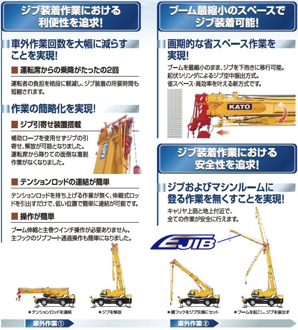 ・ジブの引寄せ解放作業と格納連結解除作業を車外における手動作業からジブ引寄せ装置とジブ伸縮を用いた車内操作に変えた。