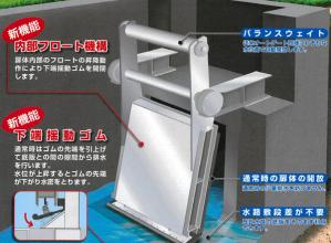 ・河川低水位時の自然排水性を向上させることで、当該ゲート形式の問題点である異物挟み込みによる不完全閉鎖障害の危険性を低減させる。河川洪水時には管理者の操作を必要とせずに自動開閉作動に切り替えて運用することができ、適宜・的確な自動止水、自動排水を行うことでゲート設備運用の安全性、有効性を向上させる。