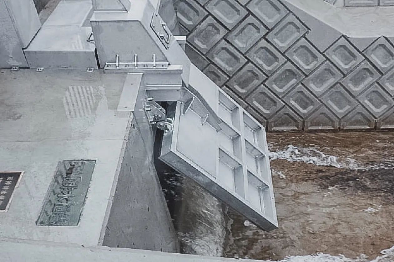 ・ 河川水位が予め設定した水位まで上昇すると、扉体開放状態の保持が自動的に解除され、扉体は上部ヒンジ式フラップゲート本来の自動開閉作動に切替わる。その後、河川水位が高い間、ゲートは継続して水位変化に対応した自動止水、自動排水を繰り返し行う。