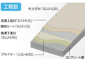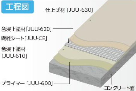 ・含浸下塗材に不陸修正機能を付与し、繊維シートを作業性の良いものに変えたことにより、全7工程から全5工程に減少させることができ、工程の短縮、経済性が向上する。
