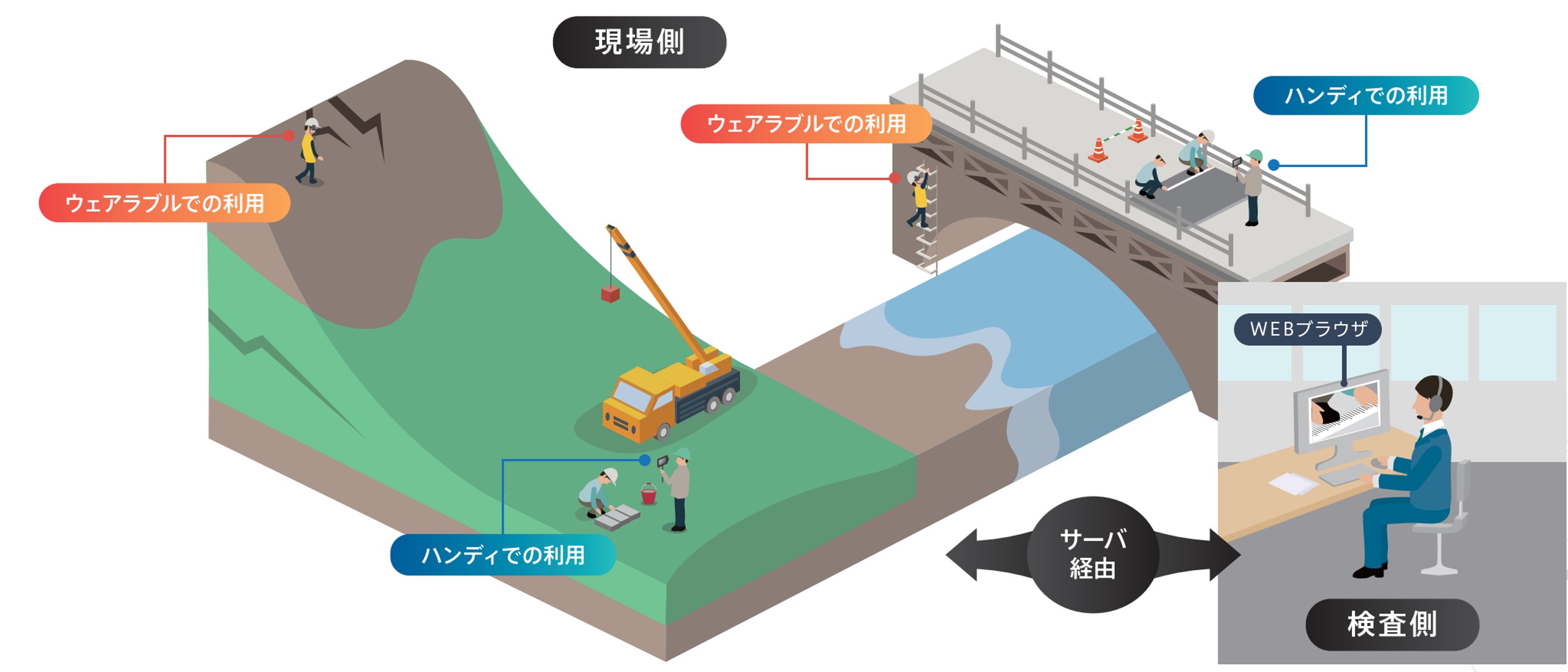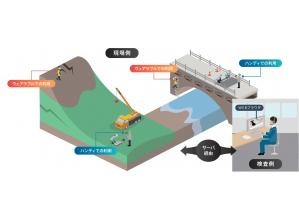 検査・立会・安全衛生管理活動等の実施方法を、現場に赴いての臨場から現場用端末(スマートフォン)と専用アプリ、専用クラウドサーバによる遠隔臨場とした。