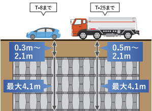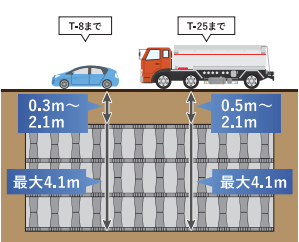 「堅牢性」と「強度」と「水槽内の余裕」を同時に満たす特許技術は、テンレイン・スクラム工法の最大の特徴。本体と本体の間に160mmの空隙部を設け、その空隙部をまたぐように本体を重ねていく独特の組立工方法。スクラムをくみ上げる強固な構造イメージで、内部の空間をより広く確保することは「空隙率」向上につながり、空隙部は多様な用途(水位点検孔や通気口など)も可能とする。
