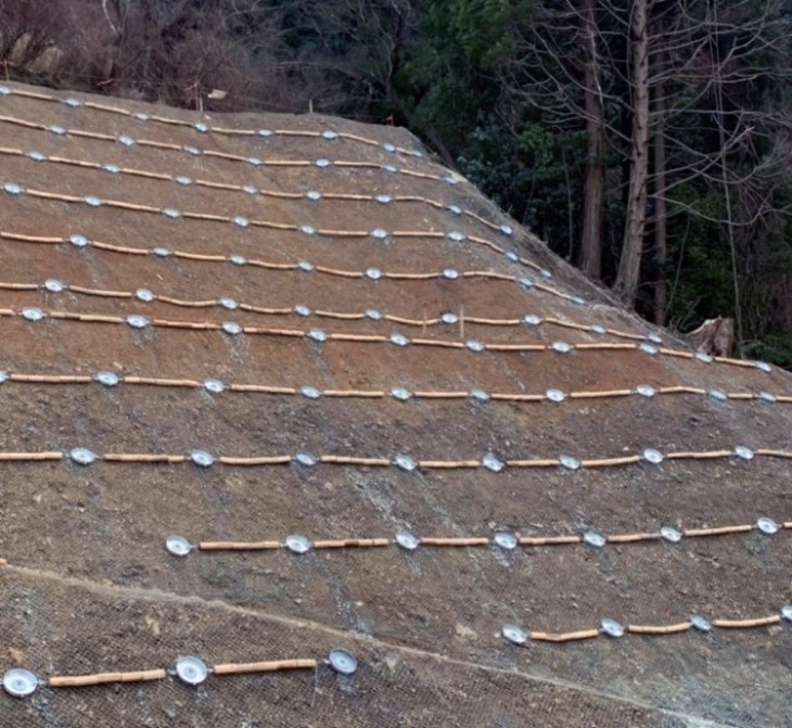 ・筋工は斜面を階段状化し、表土の流亡を抑えるとともに植生の生育環境となる棚となる。