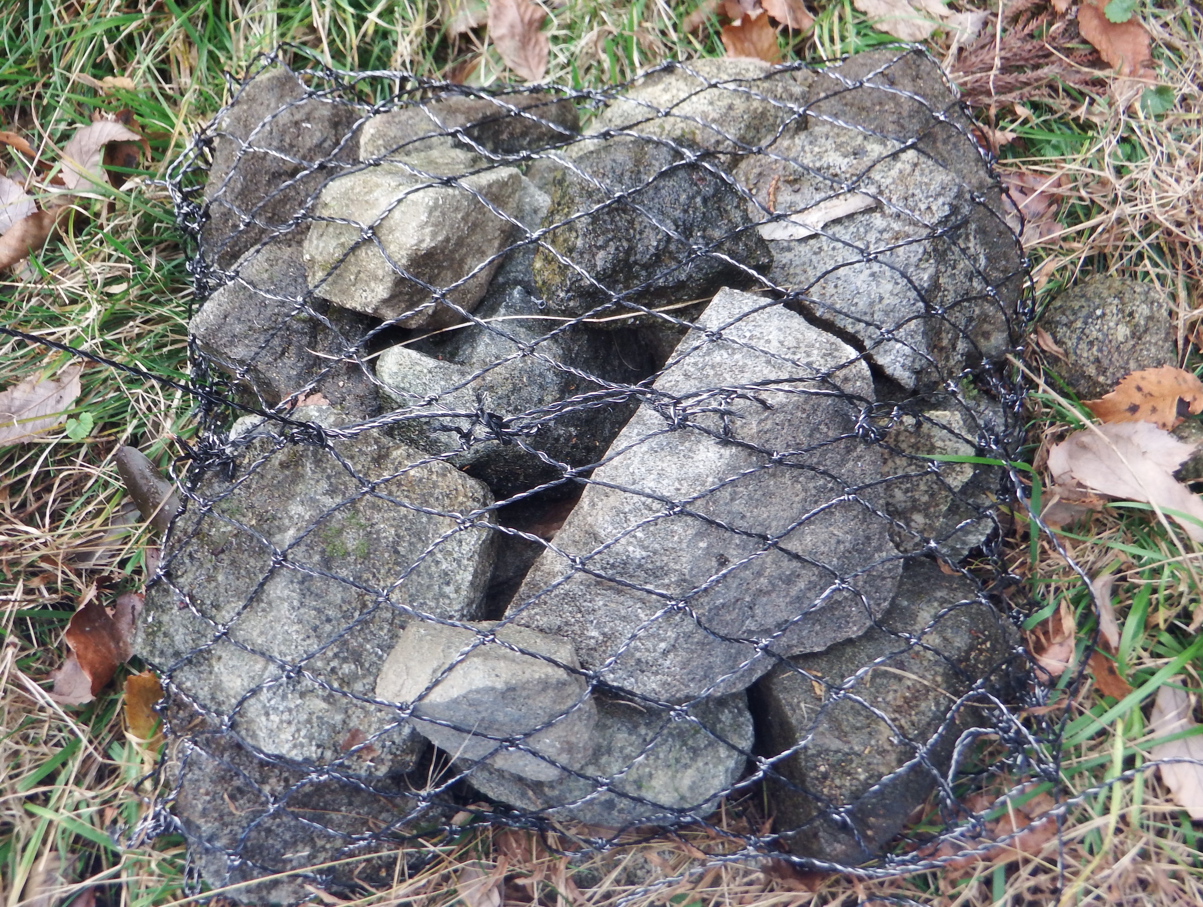 ナイロン繊維とステンレスワイヤーを編み込んだネット。袋の中に入れる石を現地調達することで、運搬を軽量化。山地の浸食防止や分水工対策など様々な使用用途がある。また、山地歩道整備や災害で崩壊した道路の隙間埋めなどの仮復旧にも使用できる。