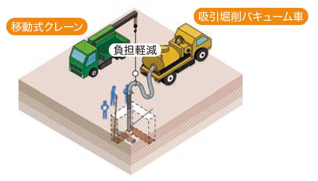 1.安全・低リスク 掘削穴に入らず地上面から作業可能で人身災害を低減。人力での作業困難な場所での施工を可能とする。埋設物を目視にて確認可能。
