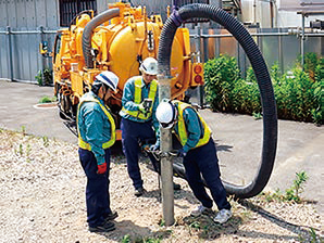 ハイパワーのバキュームポンプで、地中埋設物は傷つけることなく土砂・砕石・水を吸い上げながら掘り進める。